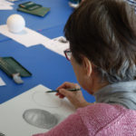 再來,就是要把這個圓變成球體。最理想的情況下,環境中的光源是單一且固定的,所以球體只會有一個高光點,暗面也會是連續均勻的。先大略分出明面跟暗面,再一層層按著球體的曲線疊上不同方向的筆觸。然後我們也要畫出影子。影子最暗的地方就是跟球體接觸的部分。