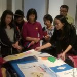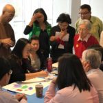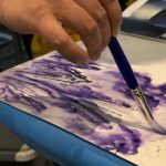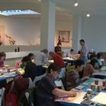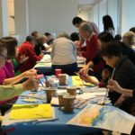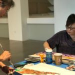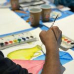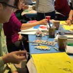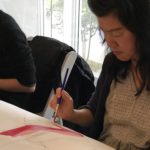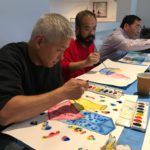今天我們學習了如何用色彩三原色的黃,紅,藍來調配其他顏色。暸解暖色系,冷色系,和中性顏色的不同,以及利用對比色或同色系來創造不同的感覺和氣氛。學員們也學會塗刷清水來延展畫紙或繃畫紙(stretch paper)防止水彩紙皺折。這一週同學們各自帶了2-3張對自己有意義的相片或影像。我們學會如何用框格和比例去計算描繪平面的影像。學員將3個不同的元素或圖像,用最穩固的三角形構圖法和重疊的方式讓圖像在同一個空間連接來敘述一個新的故事。作品內也應用乾畫法(等底層水彩徹底乾燥再添加另一種顏色)來堆疊出不同的層次與色彩。因為每個學員都自我選擇了題材和顏色,所有每一張作品都有作者濃厚的風格和創造力。