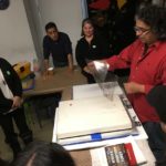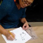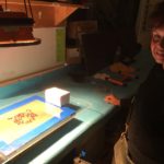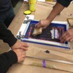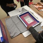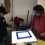 Then we proceeded to burn or expose our designs in the meshes with the photosensitive emulsion. Some students used the Rubilith (red), to make their designs, which gives better results to burn in the mesh.