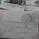 15 min. – We started this time with a quick warm up with the opposite hand on newsprint. Following a short warmup, the students look at a sample demonstration of how to decompose the landscape photograph into shapes. They also see a sample for identifying perspective lines, vanishing points and points of view on a landscape. I provide two printouts with four landscape drawing samples in each. We briefly discuss the techniques of each sample.