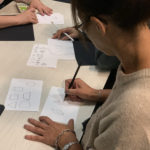 Finalizamos la sesión con el primer ejercicio de diseño de un patrón: con dos de los híbridos creados practicamos el ordenamiento y repetición de formas, considerando también el espacio negativo, para crear un patrón rectangular.