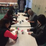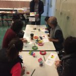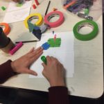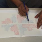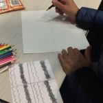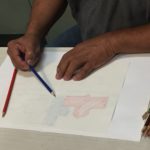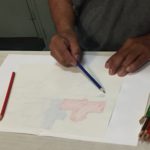 Las primeras dos sesiones, los participantes evitaron intencionalmente el uso del color para concentrarse en líneas y formas. Mientras avanzamos a diseñar los patrones individuales de cada participante, comenzamos a explorar el uso de color y textura con algunos materiales simples pero que demandan un nivel de exigencia.