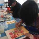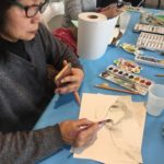 This week we took a look at Francis Picabia’s works on paper, with special attention to his ‘transparencies’ series. This body of works was mainly made between 1928 – 1931. The paintings often overlap images that draw on religious icons, mythology, and the natural world. This methodology of image making is not only a great way for the students to create a narrative by bringing different image sources, but also to play with the transparent quality of watercolor. We learned to use liquid frisket and waterproof archival ink pen to create outlines for these imageries.