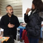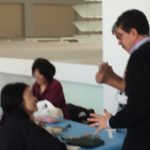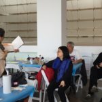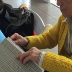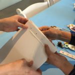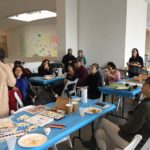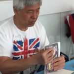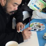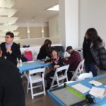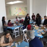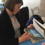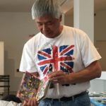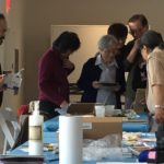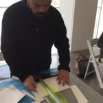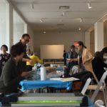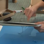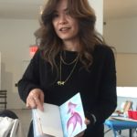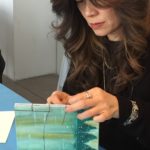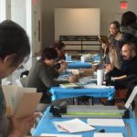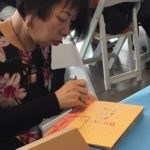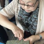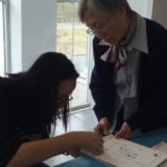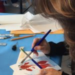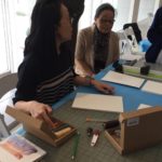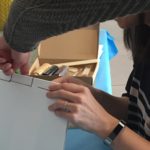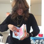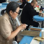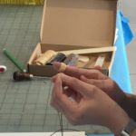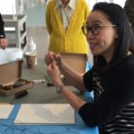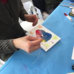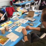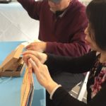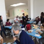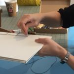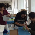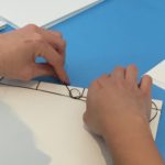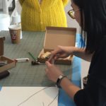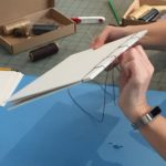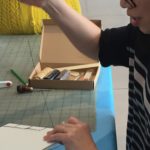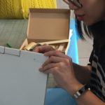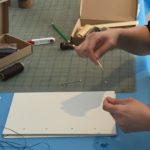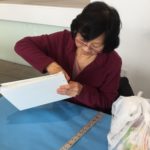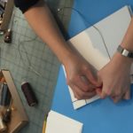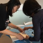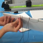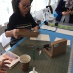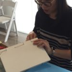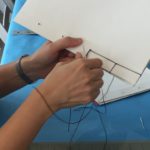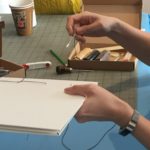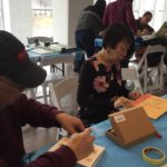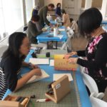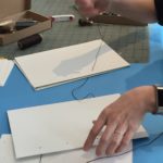 在這最後ㄧ堂課中我們學習如何把封面和內頁裝訂縫製成一本書。首先確保頁面和封面的四個孔都對齊。測量你需要的蠟線的長度,長度是書脊的六倍長。將針穿好並開始將針從後蓋穿過第二個孔。將針纏繞在脊柱上並返回第二個孔。確保在末端留下3-4英寸的線以方便最後打結。繼續穿過第一個洞並將針頭纏繞在脊柱上並重新穿過。將線纏繞在書本底部並返回第一個洞。將線穿過第二個孔並穿過第三個孔。繼續沿著脊柱纏繞然後到第四個洞的相同步驟。最後繞過書的頂部,將線圈繞回第四洞和第三洞,並在線頭結束的地方打上一個死結。穿線的過程中要把線拉緊。為了怕把針穿過之前穿好的蠟線中間,我們要把封面和內頁上的孔打大一點。今天學員們都完成了各自的藝術書。每件作品都充滿了自己的內涵,觀念和創意。Great job! 如果有興趣想要在自創書籍的學員可以上以下連結購買裝訂書的工具。