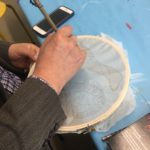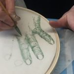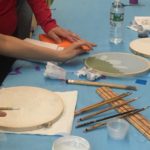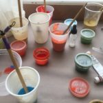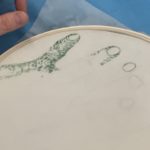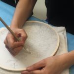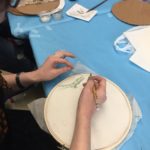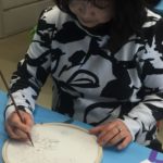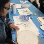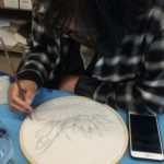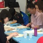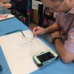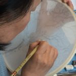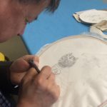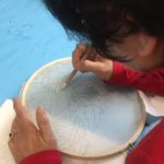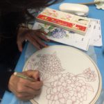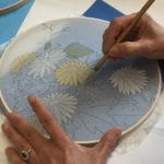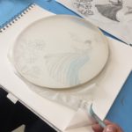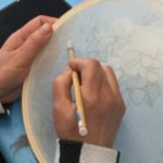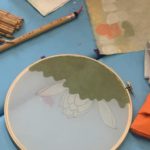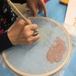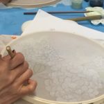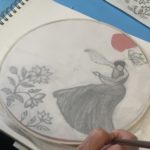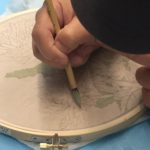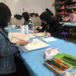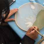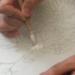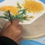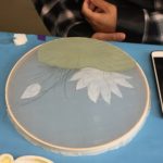In this week’s class, students painted the first layer of color. You can not build thick layers of heavy color on thin translucent silk. It is recommended to apply multiple layers of diluted pigment to create equal saturation. Thus, the brush stroke is minimized.
