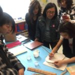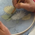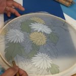 4주째에는 밑선을 그은 위에 일차 밑색 을 칠하기 시작했습니다. 비단은 장지처럼 두껍지 않고 얇고 반투명한 재료입니다. 장지처럼 두꺼운 채색을 올릴수가 없는 재료이지만 그만큼의 깊이를 내기 위해서 얇게 여러번 칠하도록 권해드렸숩니다. 또한 그럼으로서 붓자국이 남는것을 최소화할수 있습니다.