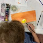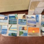 After a maximum of 45 minutes to finishing their seascape, the students return to the postcard format. With this format the students engage in a new painting. This time the painting is a landscape, from their choice of the landscape references I have provided. This small piece will work as a sketch for the next painting. Here they get to practice their warm color pallets, and choose designs before making the bigger version. The exercise is not meant to last more than 15 minutes.