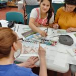 Después de la primera hora de la clase, los estudiantes tuvieron la oportunidad de participar en una demostración de técnicas de aplicación. Las técnicas estaban destinadas a dar opciones sobre cómo representar diferentes tipos de árboles, hojas, pastos y flores. Los estudiantes pudieron investigar diferentes tipos de verdes y pinceles que eran apropiados para sus palets.