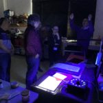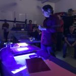 De todos modos esta vez introducimos un nuevo factor, una lámpara Led Ultravioleta de 50 W, esta luz es más efectiva que la halógena, consume muy poca energía eléctrica y no calienta, copiamos todos los films de los estudiantes y mostramos cómo se puede utilizar una emulsión vieja como bloqueador.
