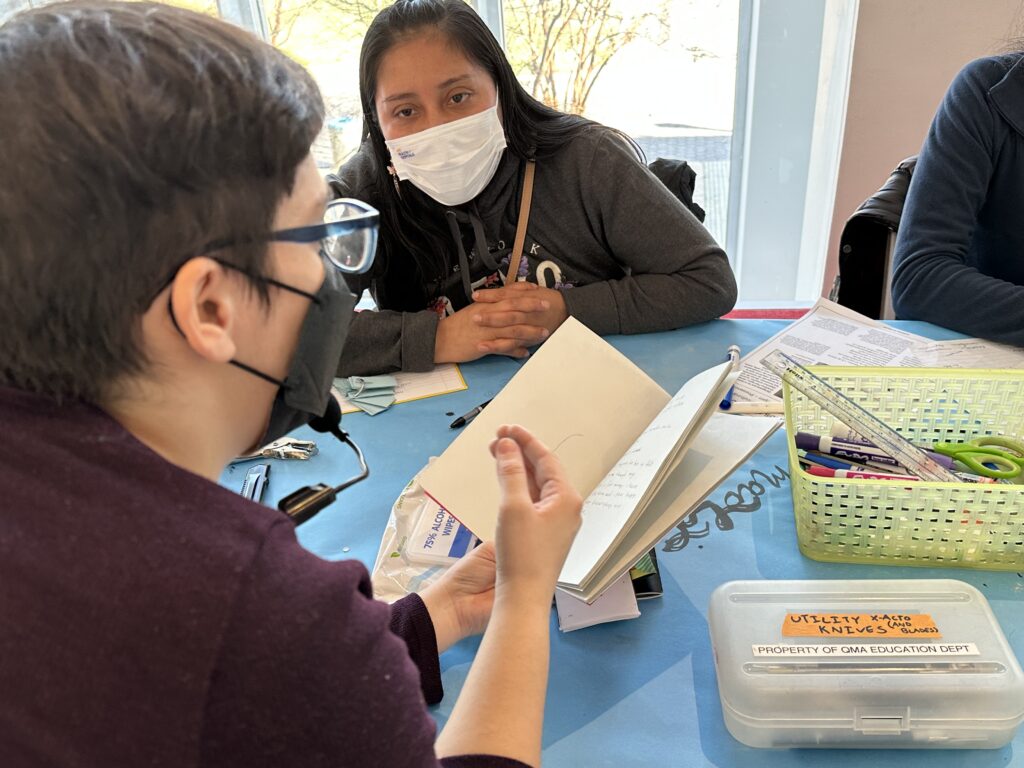 Hicimos pequeños cuadernos con páginas en blanco y una tapa donde practicar nuestras habilidades lingüísticas, tomar notas y responder a las consignas de escritura de la clase.