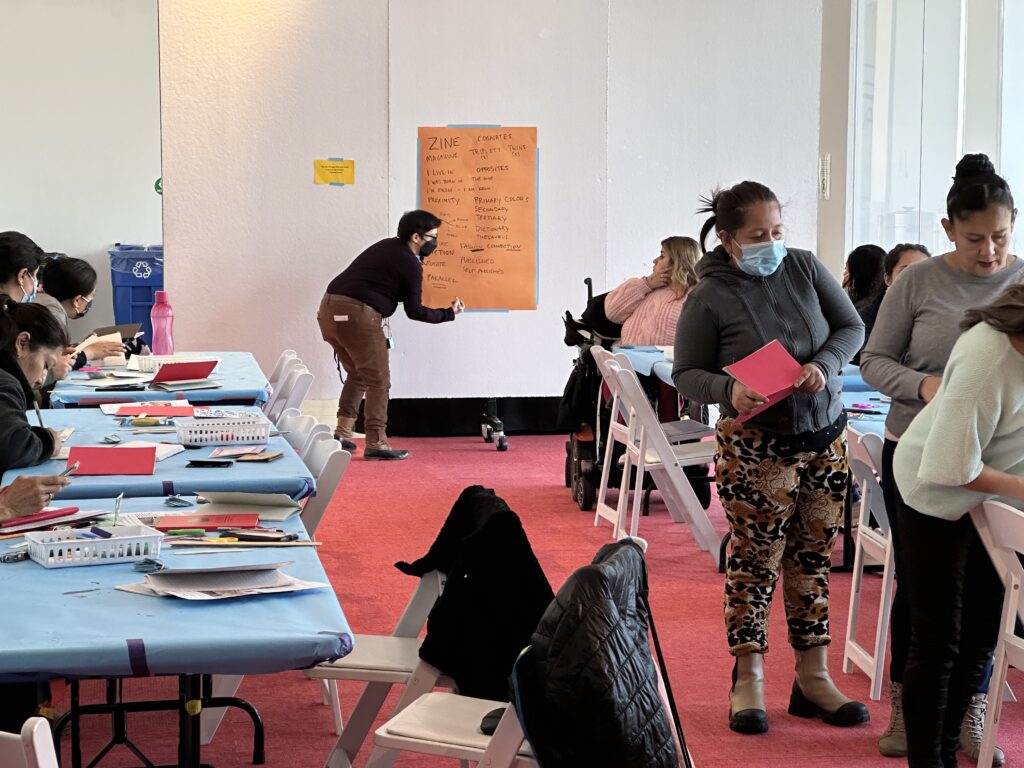 Esta semana hemos aprendido sobre los Zines, que son pequeños libros impresos. Suelen ser autoeditados y creados por artistas o activistas. Los fanzines son una forma estupenda de hacer llegar información a tu comunidad, familia y amigos. Es como una octavilla o un periódico, pero en forma de folleto. Los folletos pueden tener cualquier formato con páginas y lomo. También pueden ser sobre cualquier tema, historietas, manuales de “Cómo hacerlo”, recursos o sobre un tema de interés especial (como jardinería, poesía, procesos artísticos) o una colección de investigaciones o imágenes. Puede haber fanzines sin palabras o fanzines con todas las palabras, en ficción o no ficción. Por si no lo sabéis, ¡me ENCANTAN los fanzines!