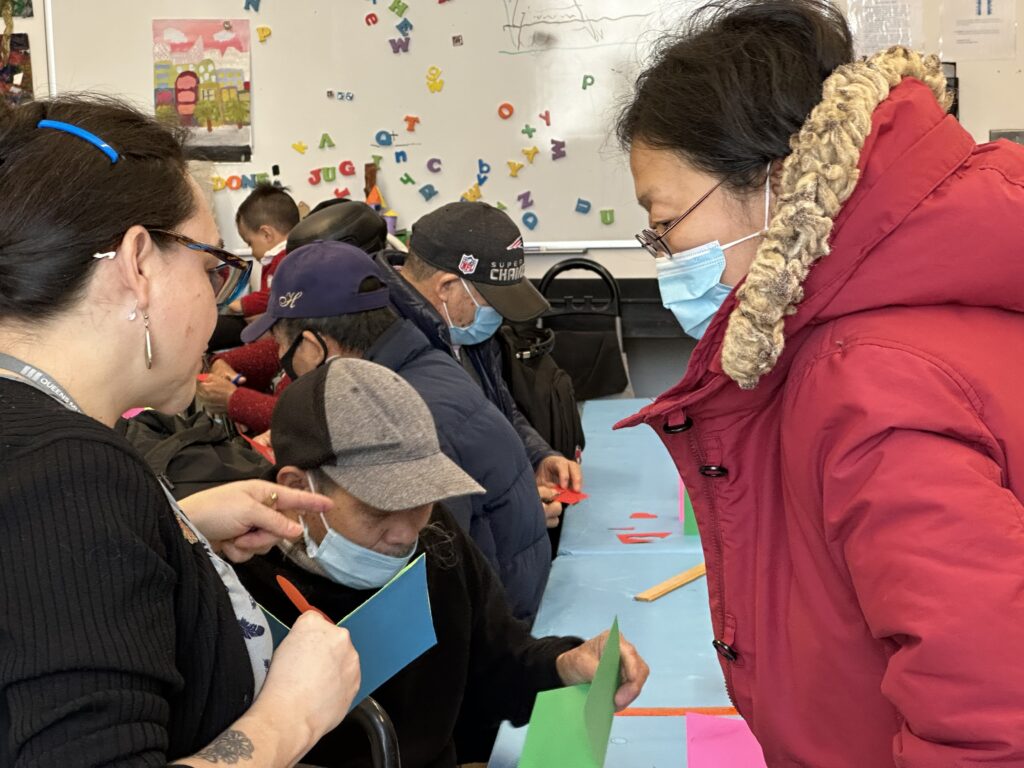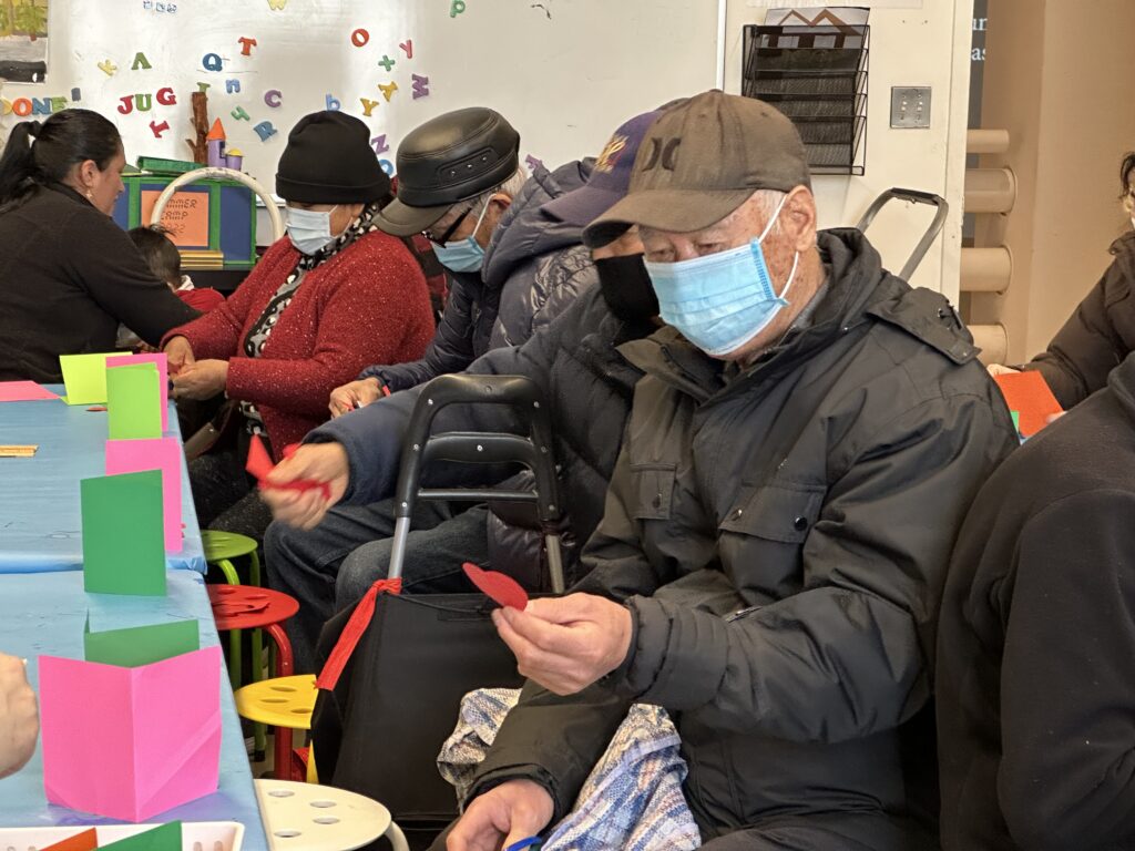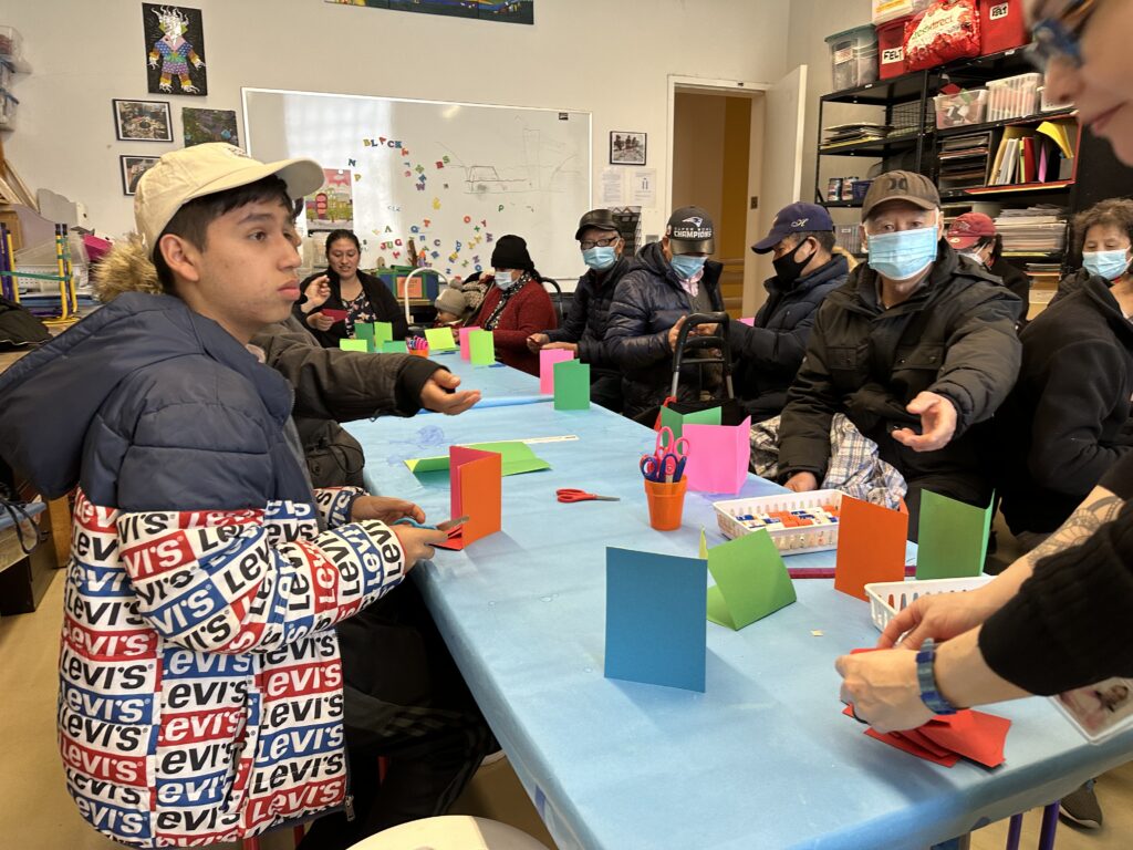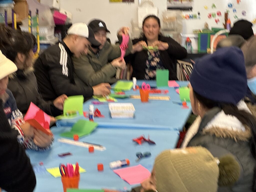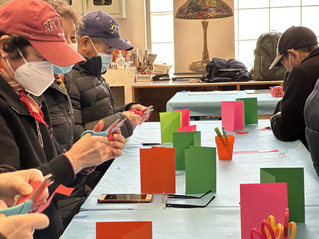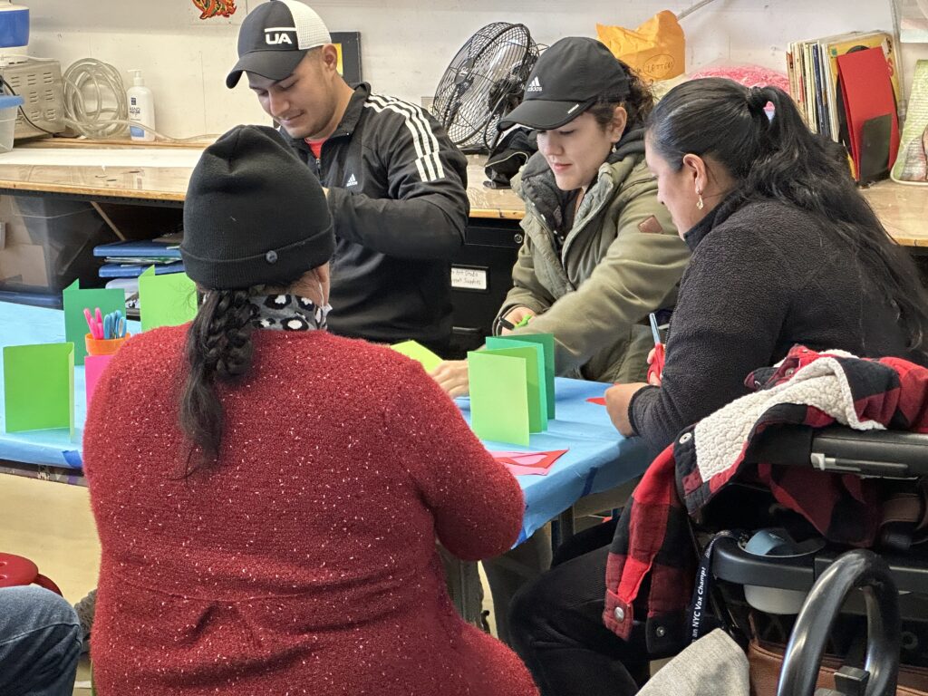 learn how to make the French Fold which is also a pop up card, but using only one sheet of paper. Later we added heart shapes. We decorated our cards as well, using Heart Shape stamps, Snow Flake stamps, and die cut shapes. This was a bilingual workshop. It was taught in