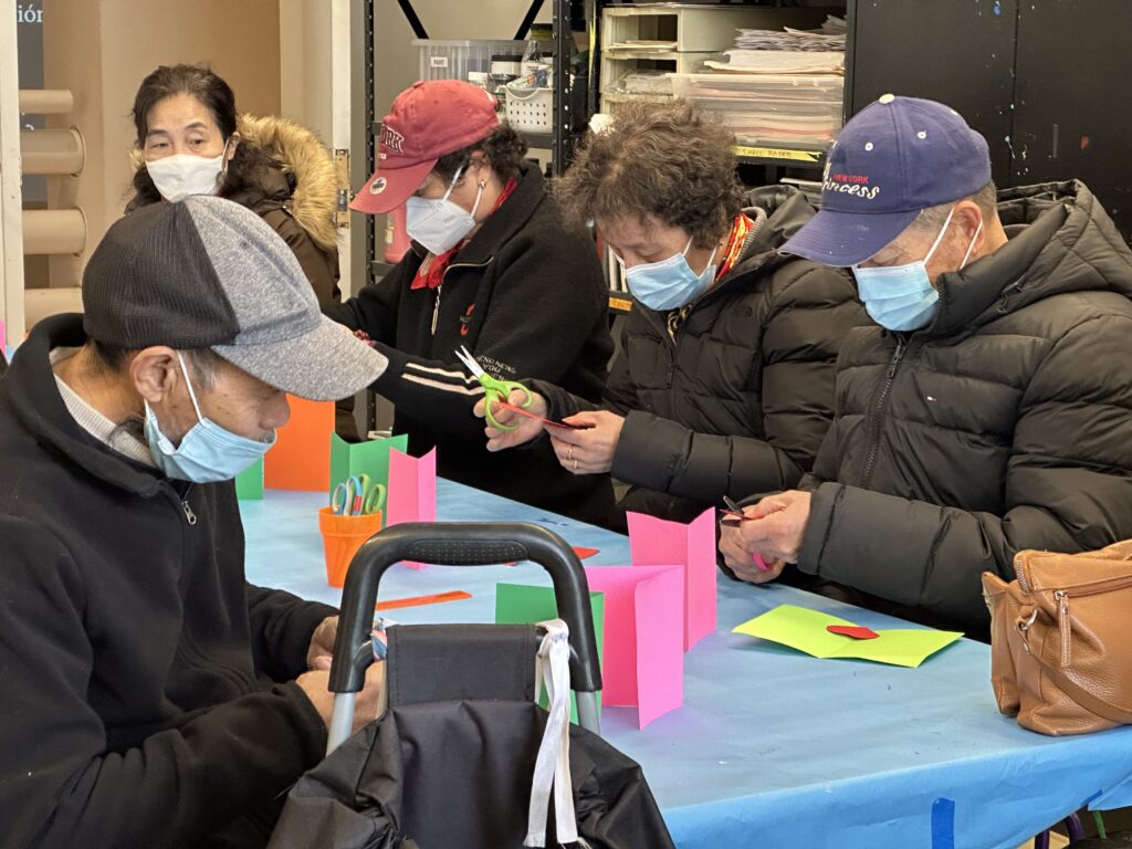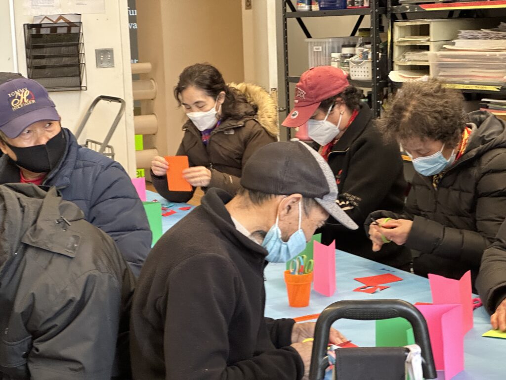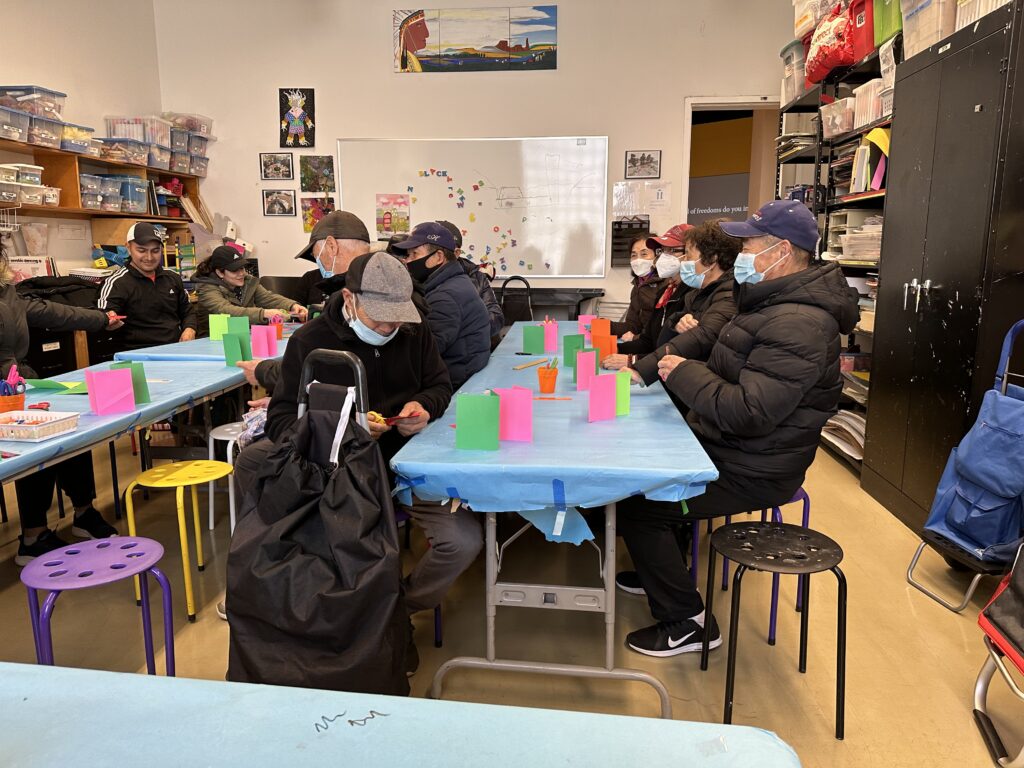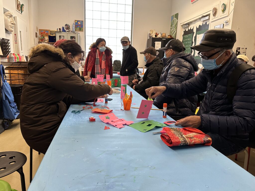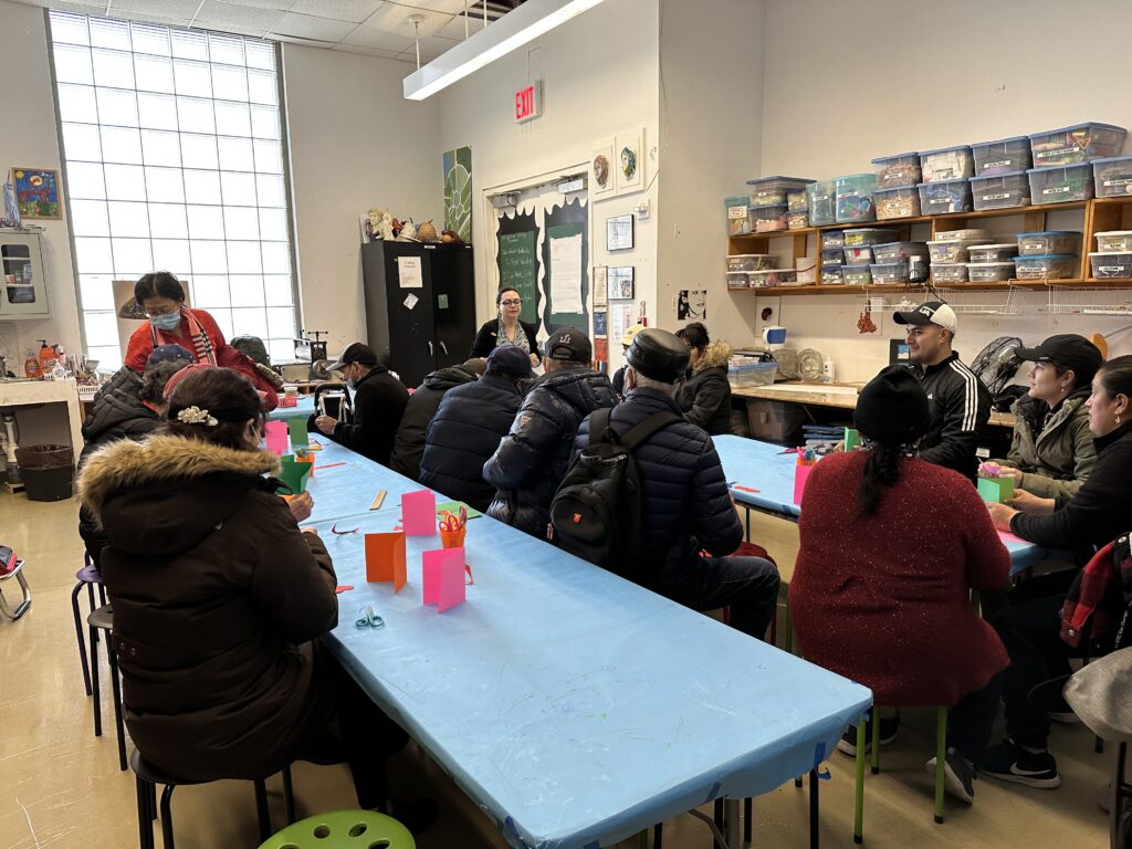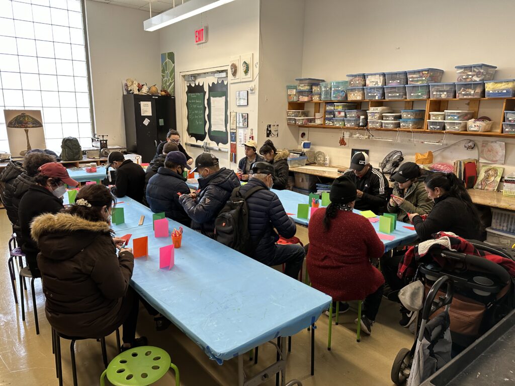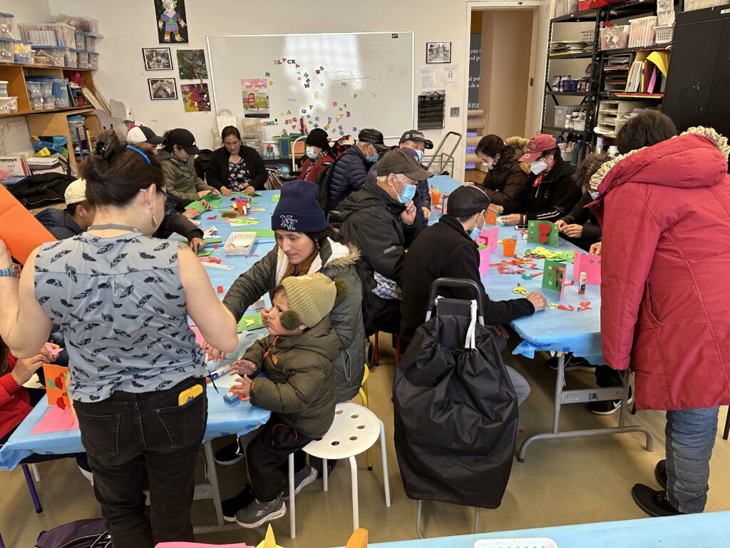 learn how to make the French Fold which is also a pop up card, but using only one sheet of paper. Later we added heart shapes. We decorated our cards as well, using Heart Shape stamps, Snow Flake stamps, and die cut shapes. This was a bilingual workshop. It was taught in