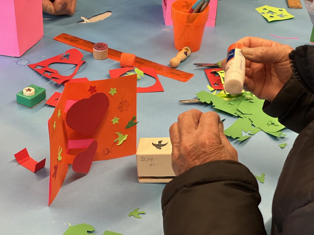In this single day workshop, we made Valentine’s cards. We used construction paper, scissors and glue sticks. First we learnt the structure of a simple “pop up” card with two sheets of paper (2 contrasting colors): one for the inside and the other for the outside of the card. We also