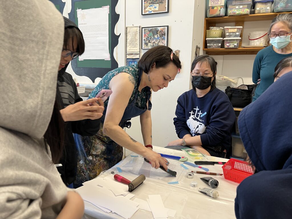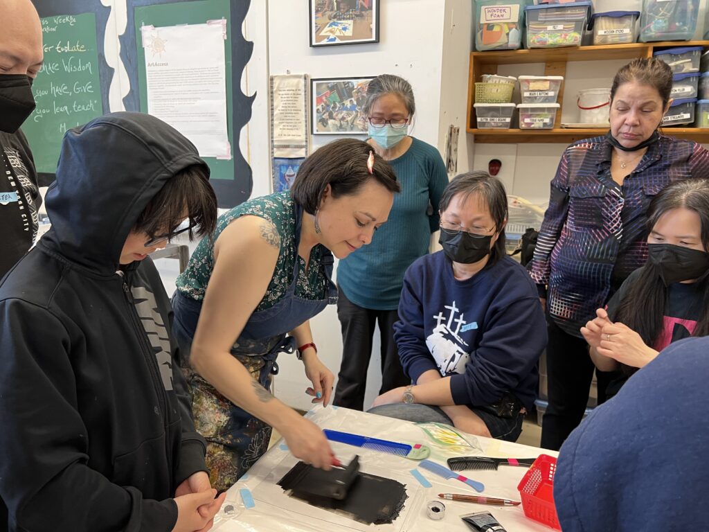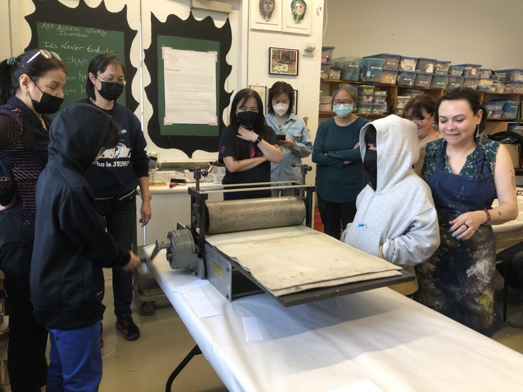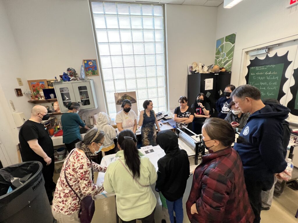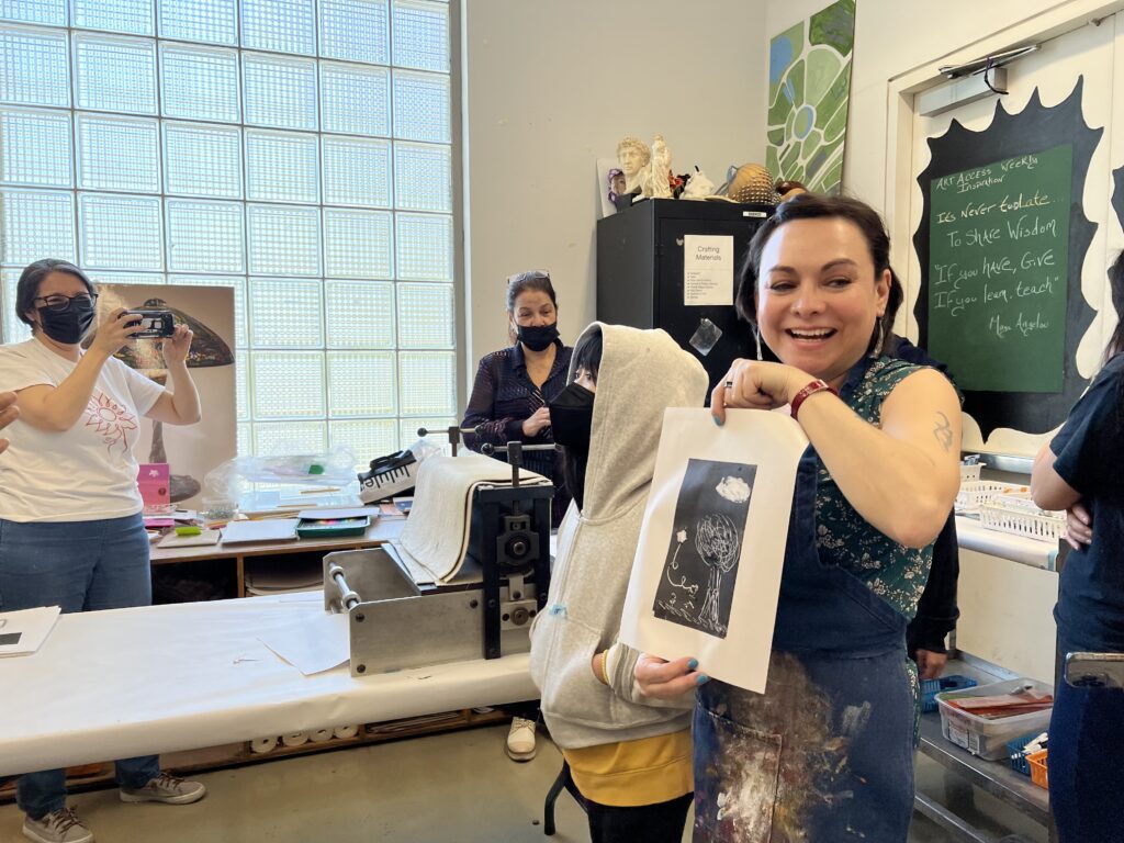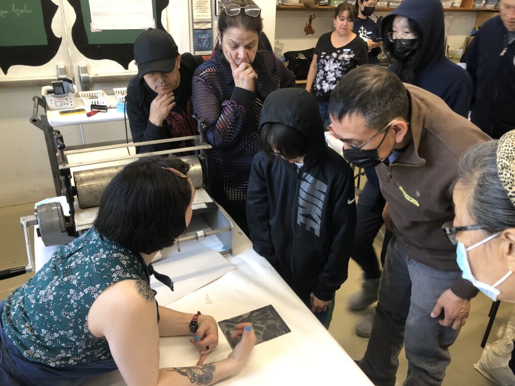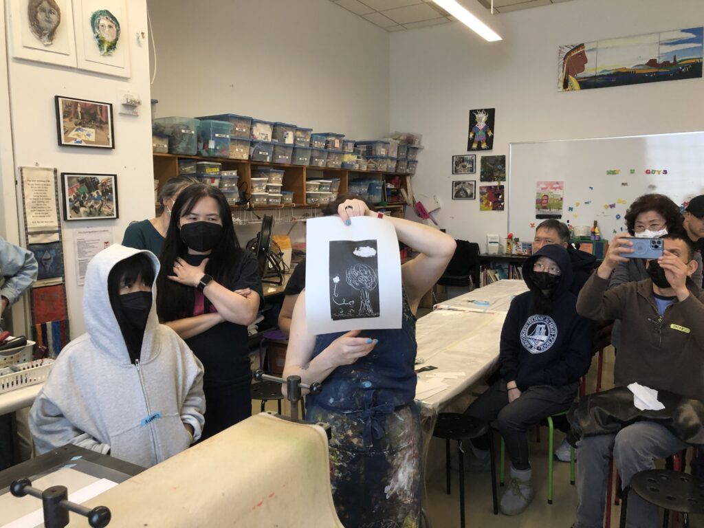 Al final de la clase, Michelle nos mostró un grabado y la placa de Linóleo correspondiente. Para la próxima sesión vamos a empezar a trabajar en los primeros pasos para hacer nuestros Linóleos. No tendremos clase la próxima semana, pero nos reuniremos el 9 de abril. Nuestra instructora nos dijo que nuestra tarea es observar el espacio negativo en cada imagen que veamos, y también pensar en términos de blanco y negro. Lo cual preparará nuestra mente y nuestros ojos, para planear mejor nuestras imágenes.