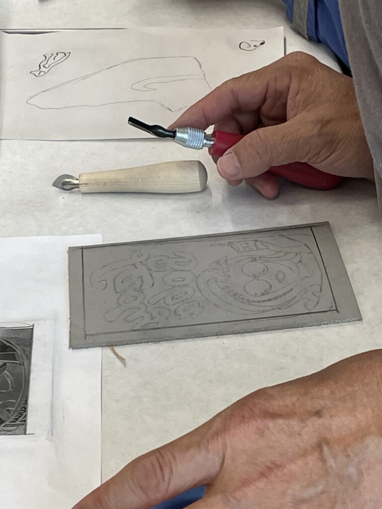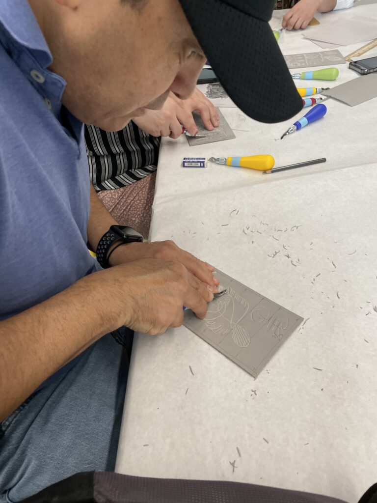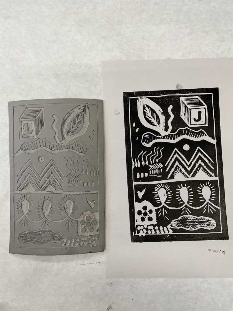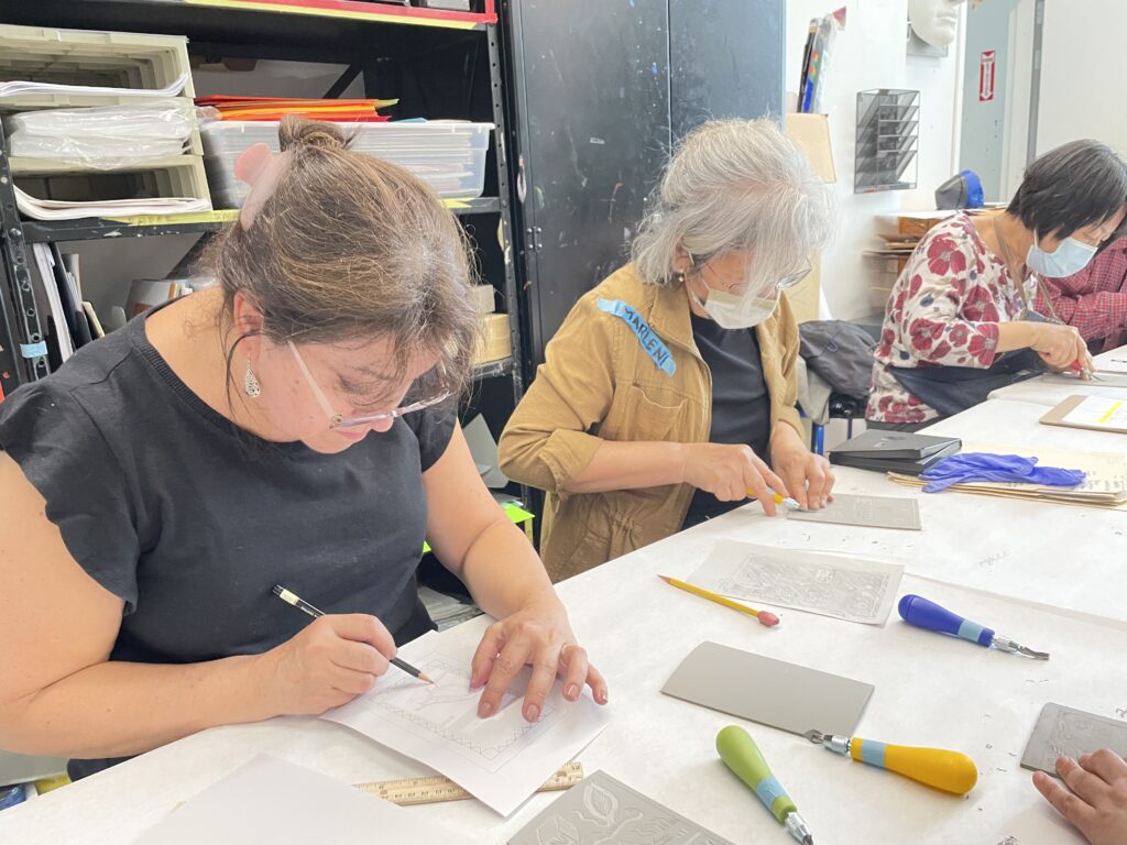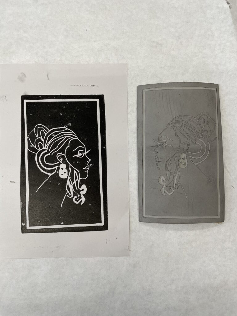 También nos enseñó una forma de transferir un boceto a una placa de linóleo colocando el boceto boca abajo y frotando suavemente la superficie posterior del papel.