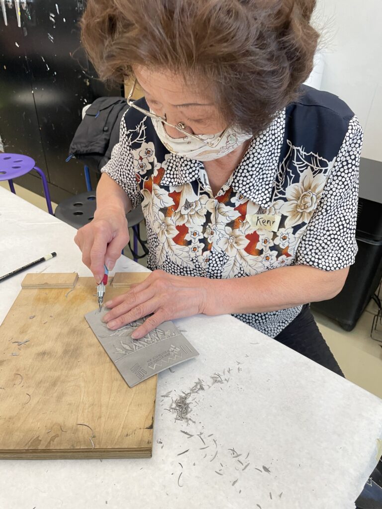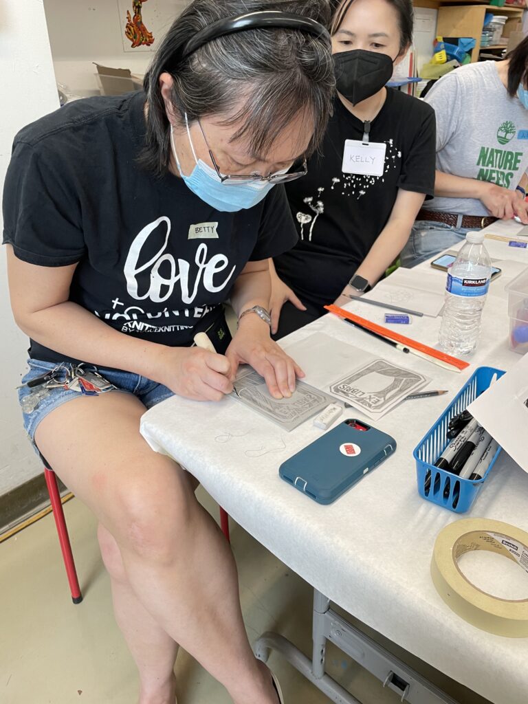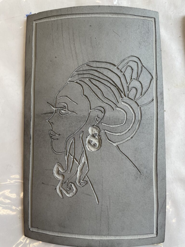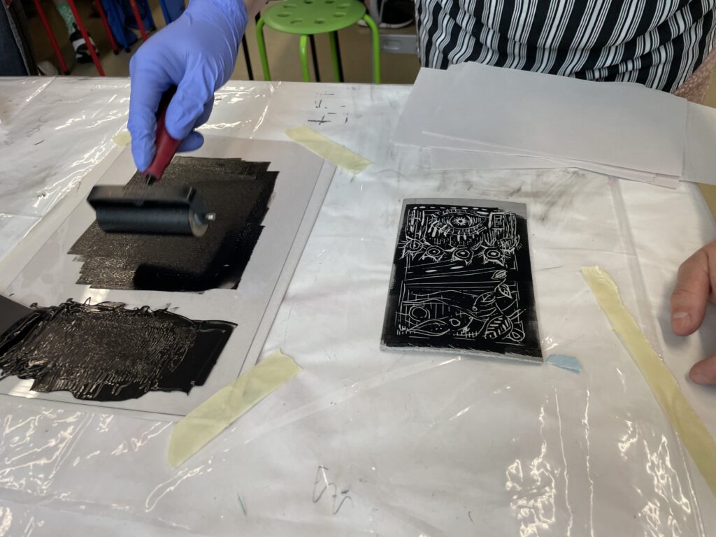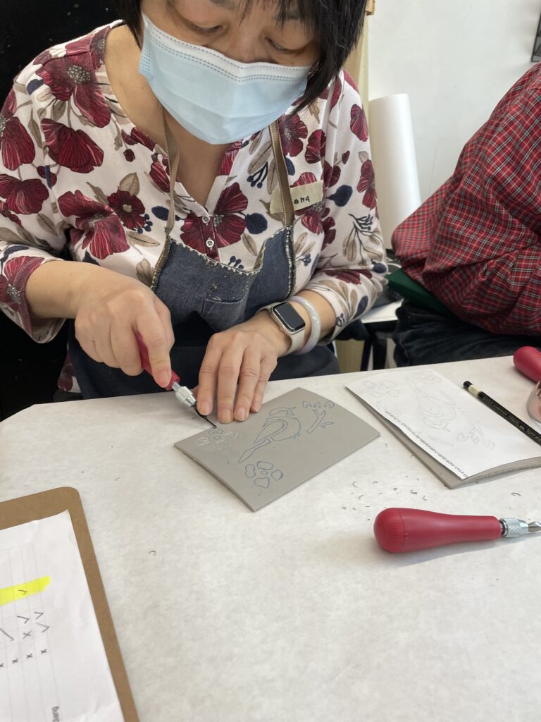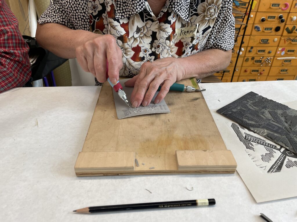 También nos enseñó una forma de transferir un boceto a una placa de linóleo colocando el boceto boca abajo y frotando suavemente la superficie posterior del papel.