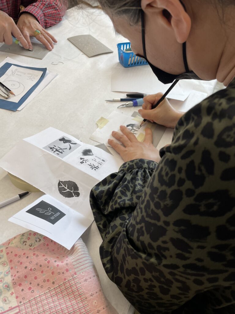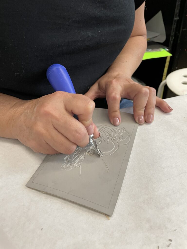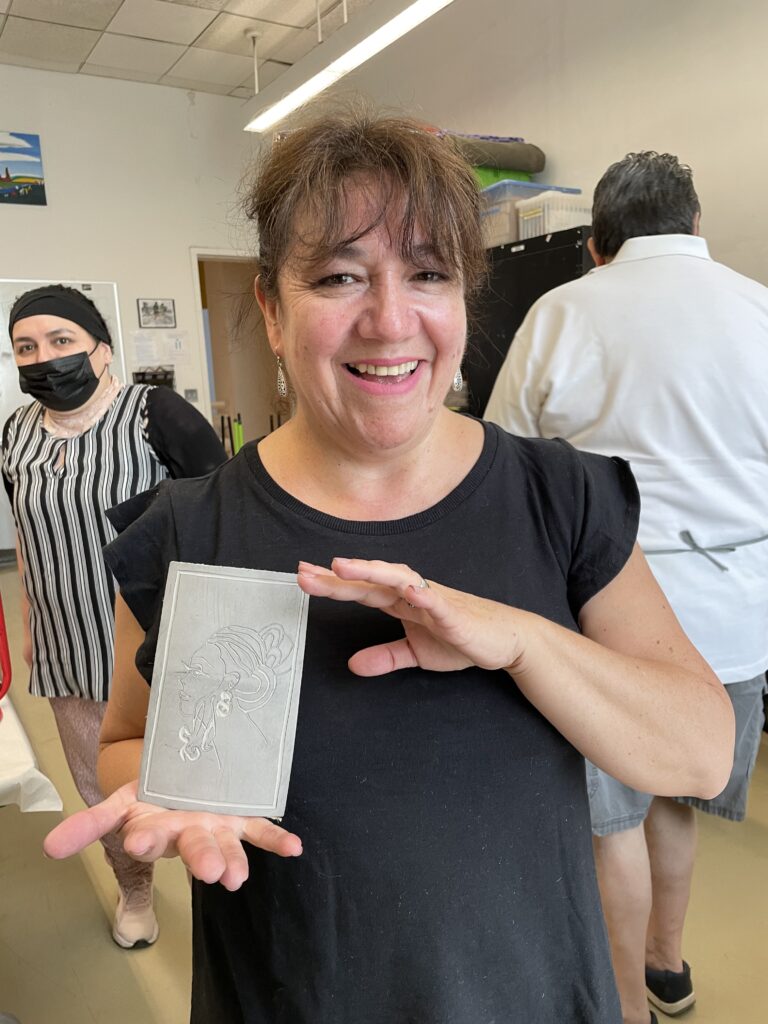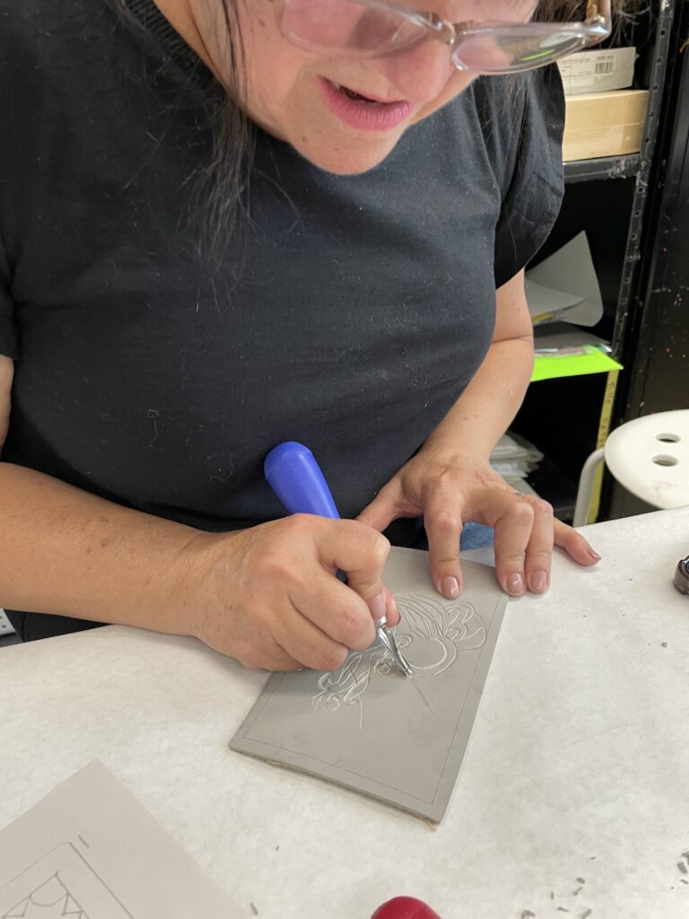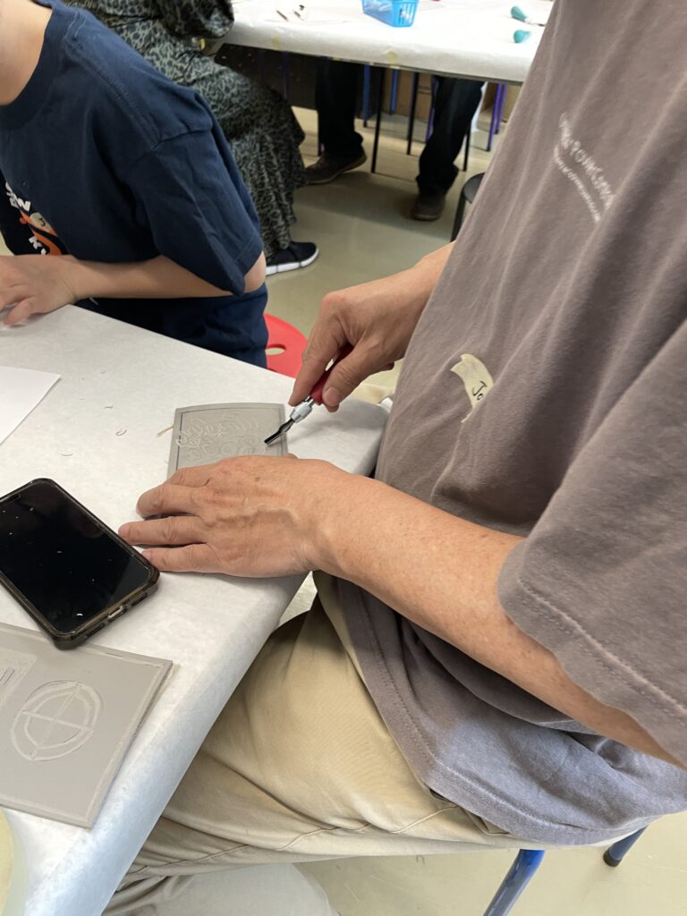 También nos enseñó una forma de transferir un boceto a una placa de linóleo colocando el boceto boca abajo y frotando suavemente la superficie posterior del papel.