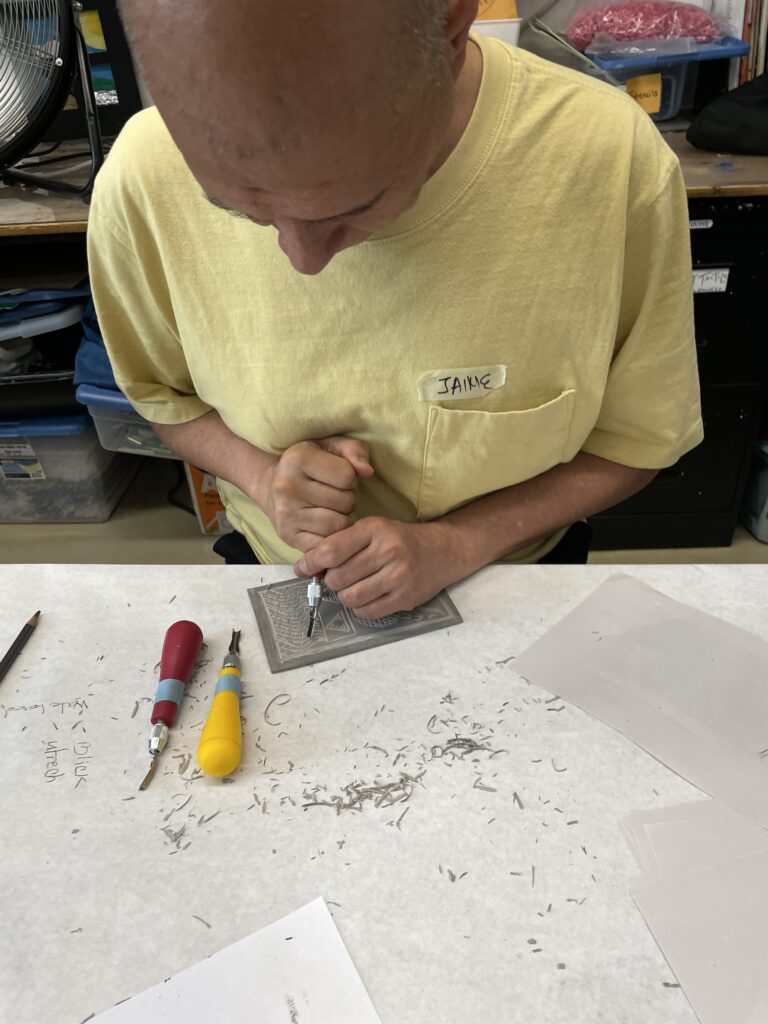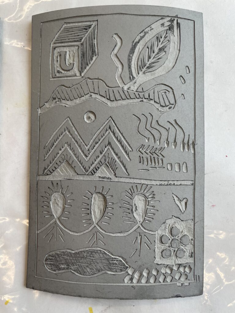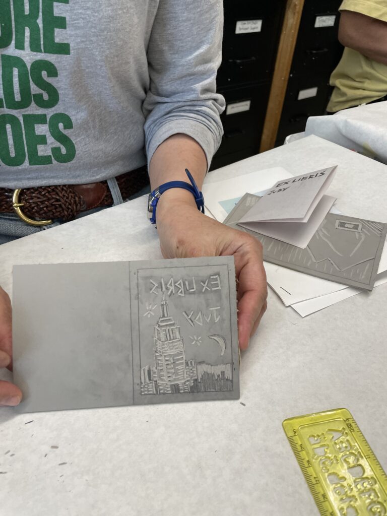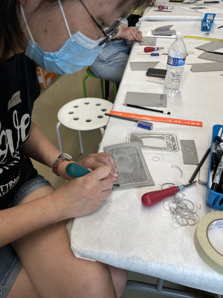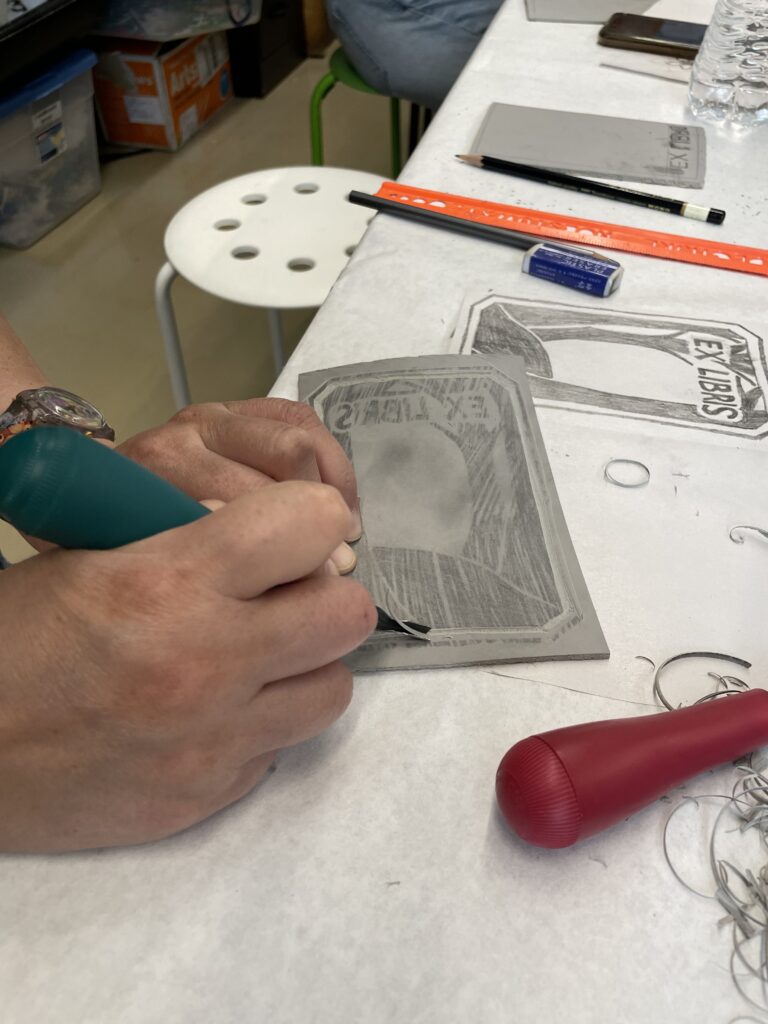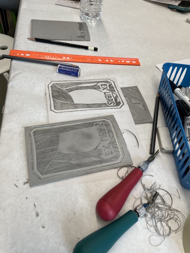 Estamos llegando al final del Taller de grabado más allá de lo básico. En esta sesion íbamos a trabajar nuestro proyecto final utilizando las marcas que habíamos practicado la semana anterior. Veniamos ya con alguna expriencia para comenzar nuestro proyecto. Michelle sugirió la posibilidad de hacer un Ex libris como proyecto final.