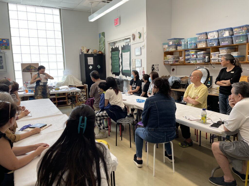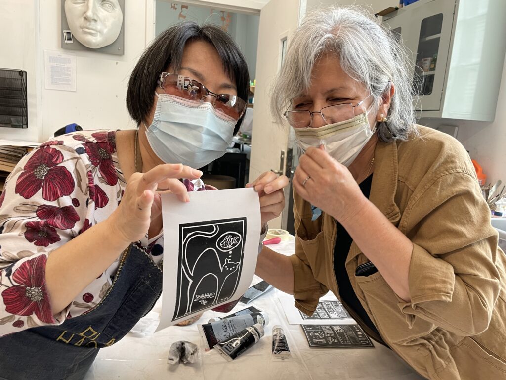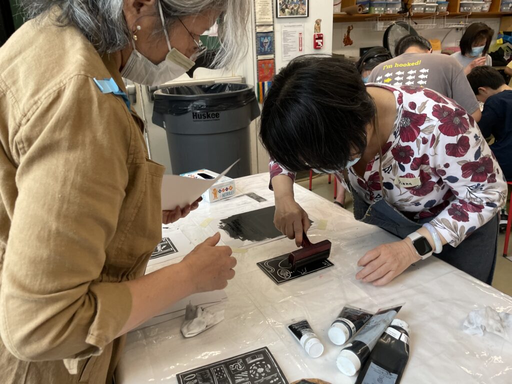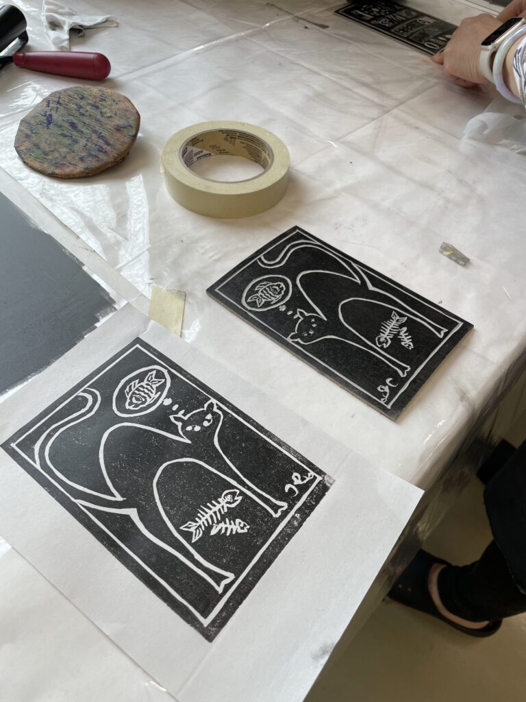 We learned how to print by hand using a Baren or a wooden spoon. A Baren is “shaped like a disc with a smooth, flat bottom”. A Baren applies even pressure to the back of printmaking paper to pull ink off the linoleum plate into the paper.