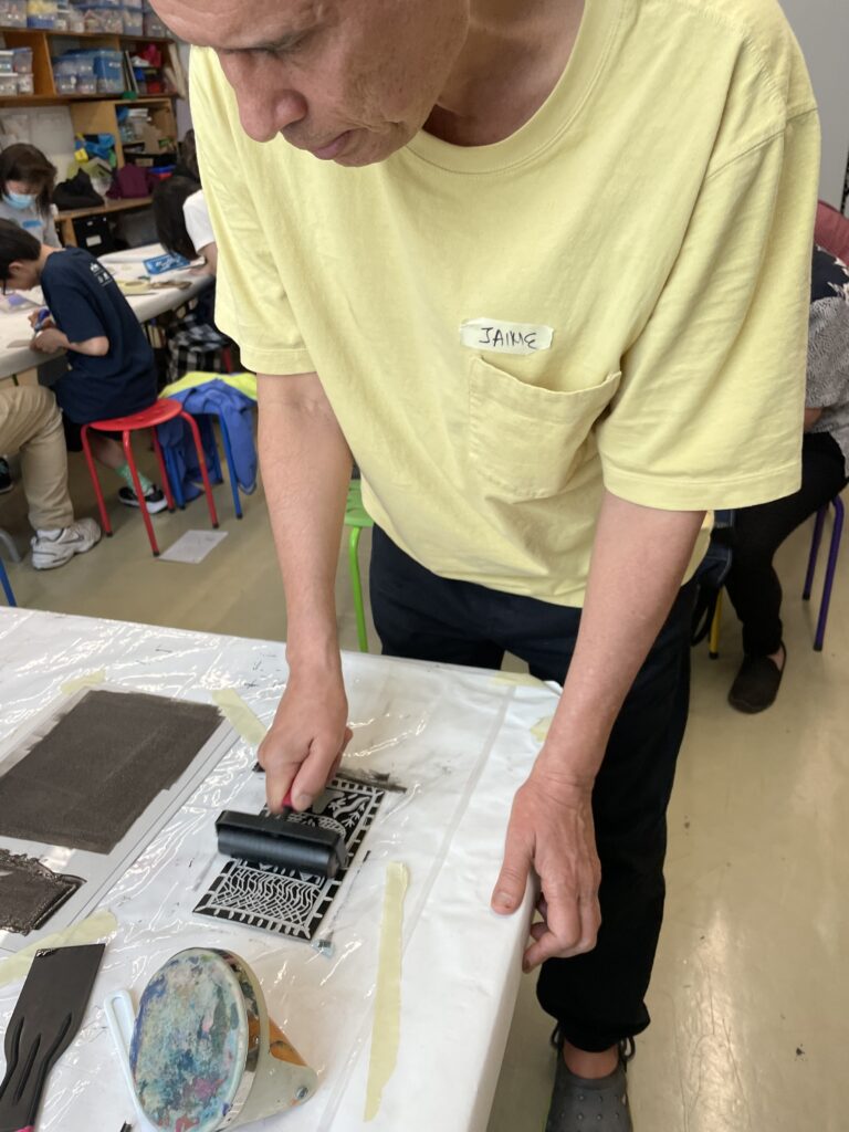 Aprendimos a imprimir manualmente usando un Baren o una cuchara de madera. El Baren tiene “la forma de un disco con la base fina y plana”. Para usar el Baren se debe aplicar presión uniforme en la parte posterior del papel haciendo movimientos circulares.