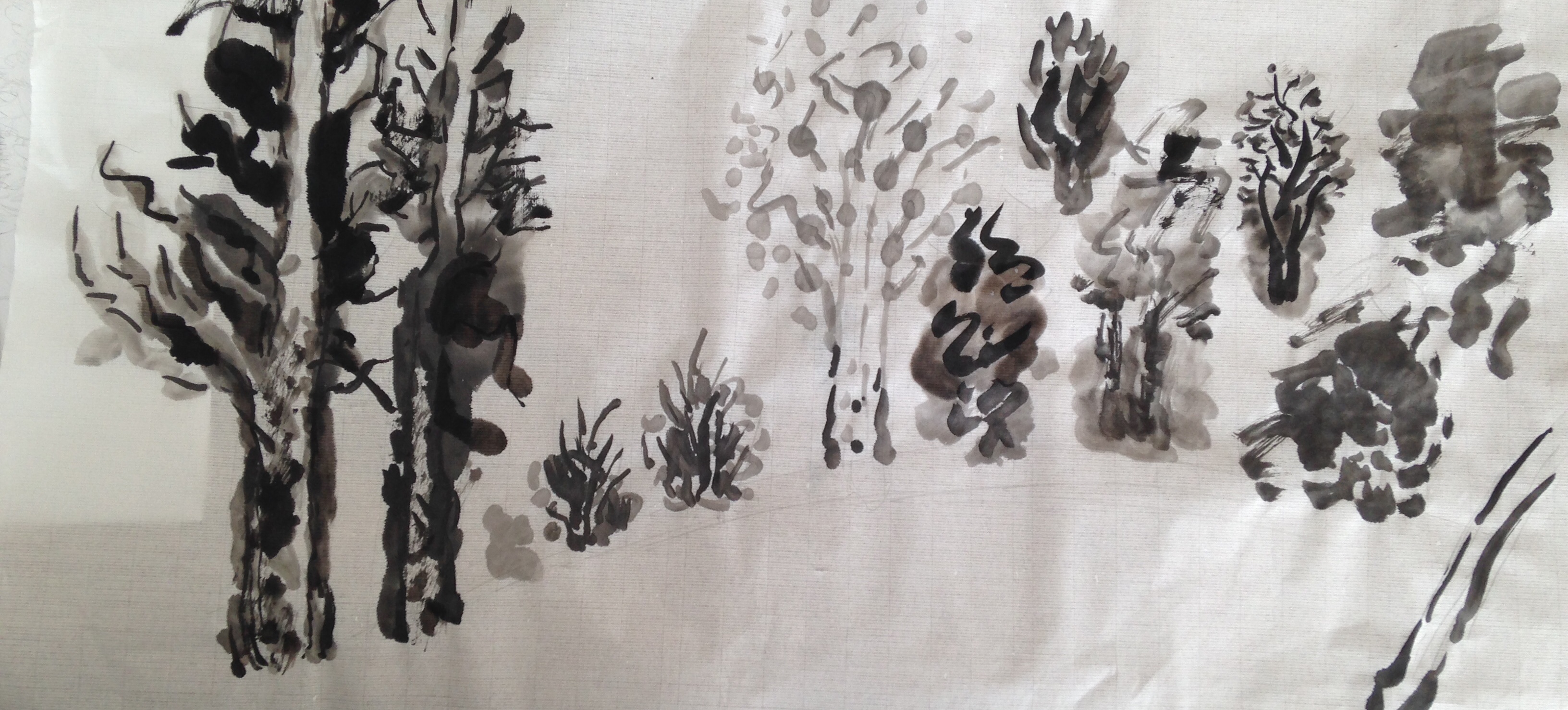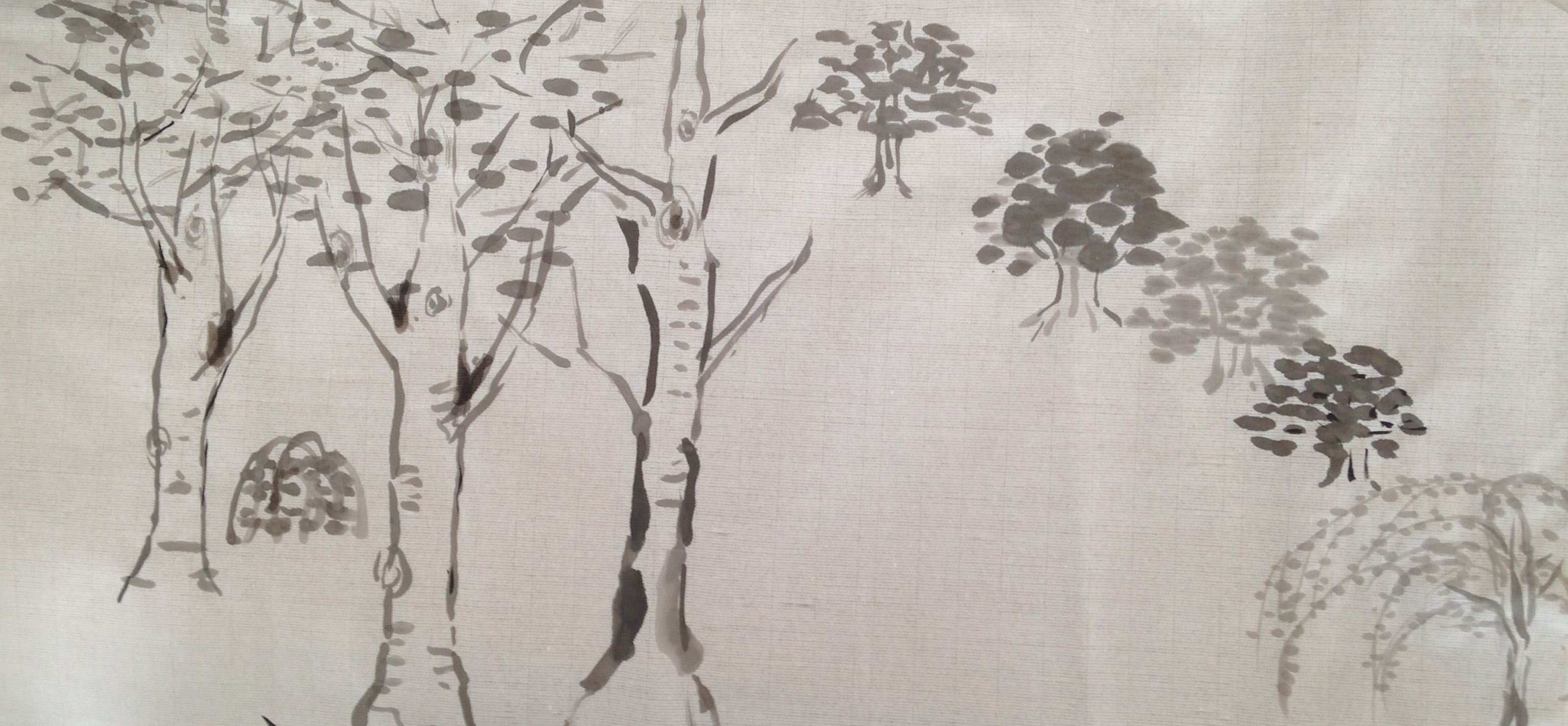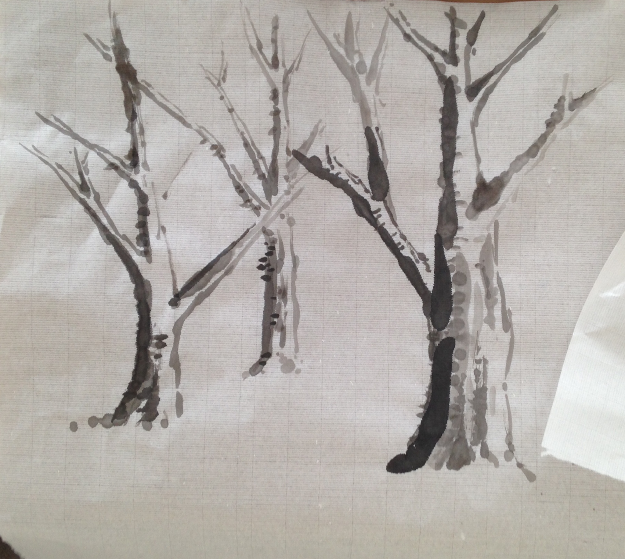 농묵, 중묵, 담묵의 사용이 고르게 잘 표현되어 있습니다. 격식에 얽매이지 않은 자유스러운 선이 돋보입니다. 나무의 키는 서로 다르지만 간격이 일정하여 지루한 느낌을 줍니다. 삼삼오오 모여있는 모습으로 그리면 조금 더 변화가 있을 것이고 구도도 좀 더 짜임새가 있어 보일 것입니다.