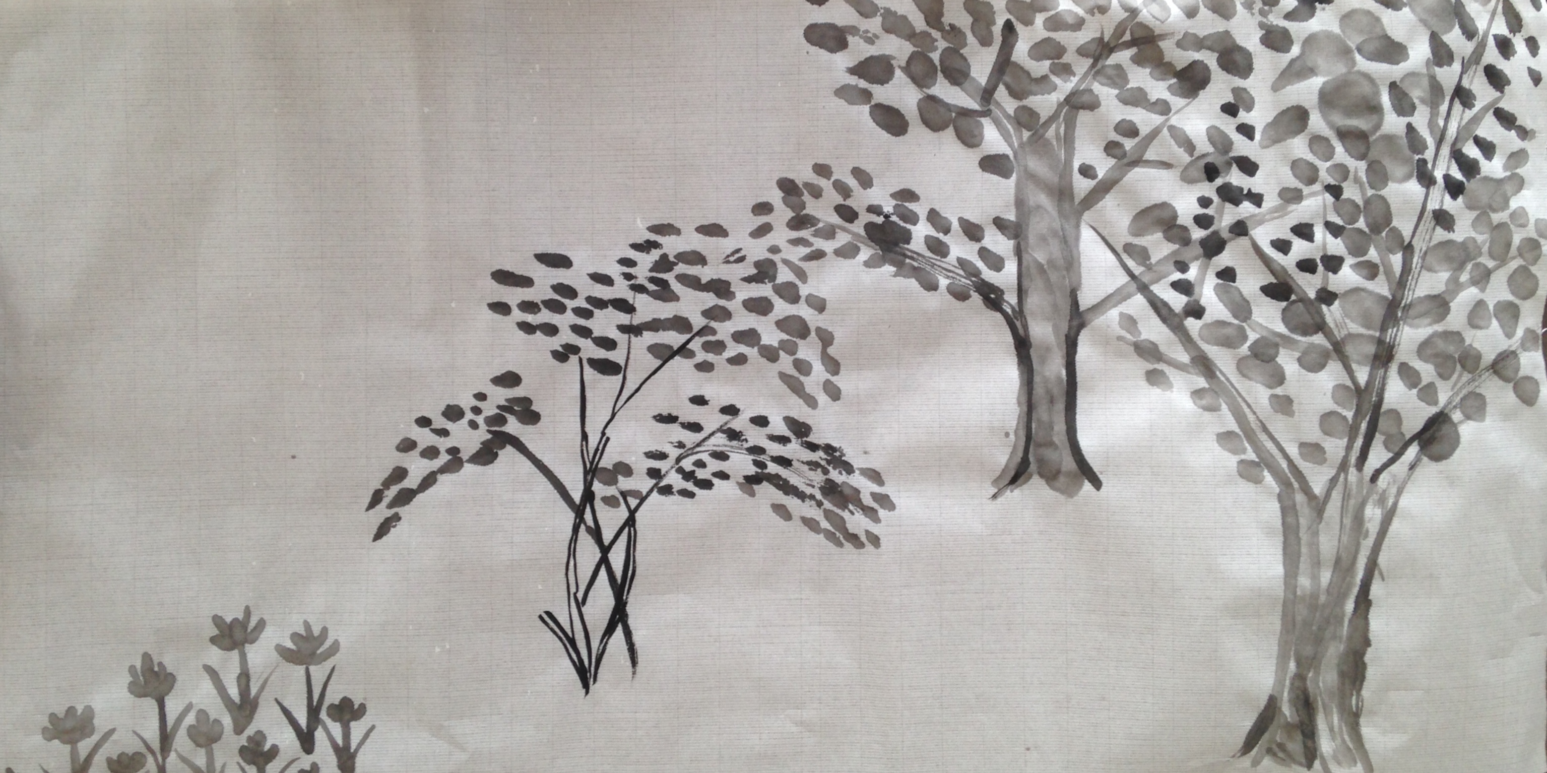 오른쪽으로 치우쳐 화면에 잘리며 겹쳐 그려진 두 개의 큰 나무들과 닿을 듯 말듯한 중간의 키 작은 나무, 왼쪽 아래로 심하게 잘려나갔지만 앙증맞게 표현된 꽃의 구도가 전체적으로 짜임새 있고 새롭습니다. 왼쪽 위로 널찍하게 남겨둔 여백의 위치와 양도 화면에 짜임새를 더합니다. 오른쪽의 두어 나무의 위치를 아래위로 달리잡아 그림으로서 두어 나무 사이의 공간감을 느낄 수 있습니다. 아직은 미숙한 점과 선의 표현이지만 꾸미지 않은 순수함이 보여서 좋습니다. 한 획 안에서의 농담과 갈필에 조금 더 신경을 쓰시면 더 발전이 있을 것입니다.
