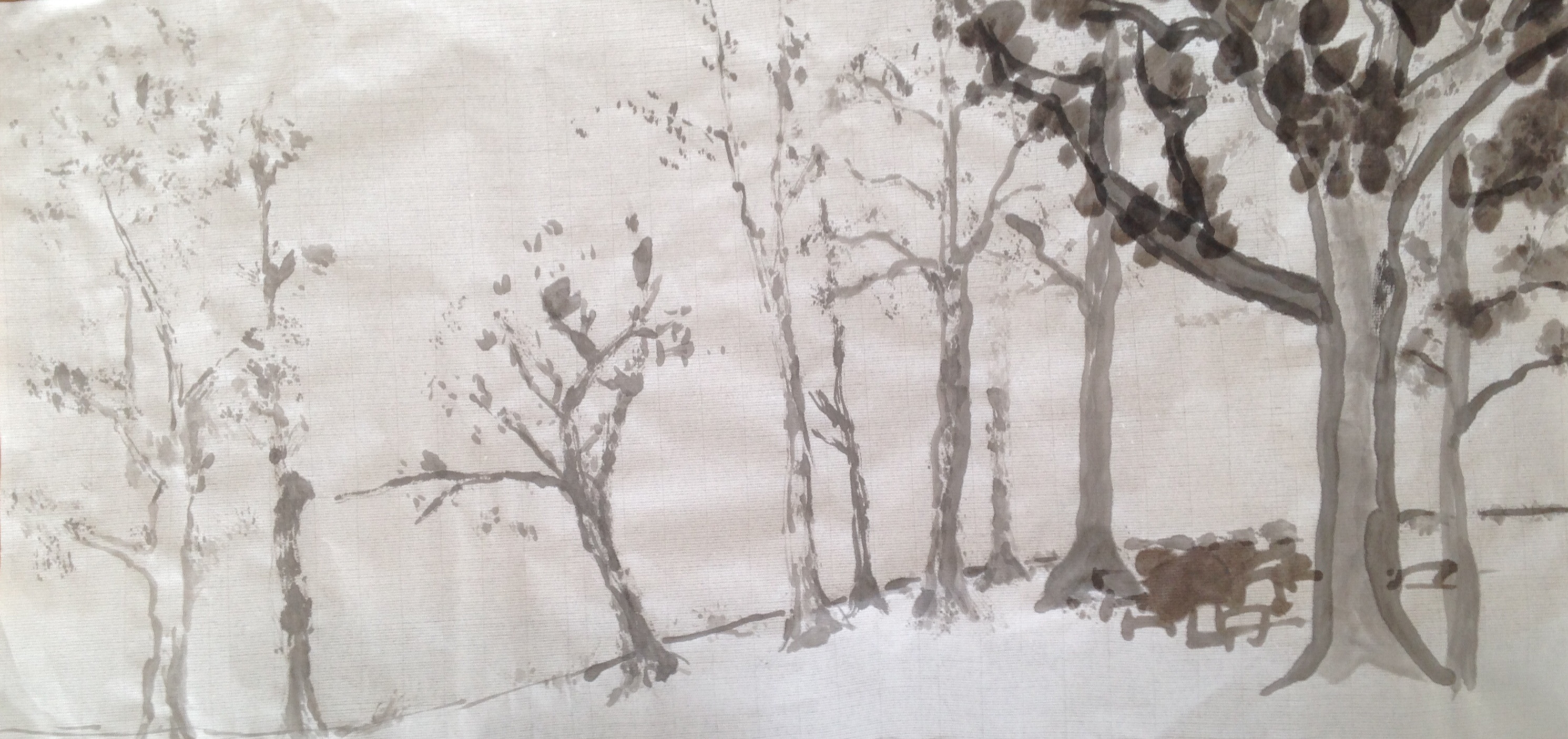 나무의 왼쪽 선이 진하고 오른쪽 선이 가늘고 흐리게 그려져서 서양화의 음영법 영향이 보이는 표현입니다. 나무의 크기와 선의 굵기 차이, 즉 앞의 나무는 굵고 진한 선으로 묘사하고 뒤의 나무는 흐리고 가는 선으로 묘사 함으로서 나무들 사이의 거리감을 표현하였습니다. 이파리는 그리지 않으셨지만 나무 둥지의 표면을 가로 점으로 찍어서 잘 표현하셨습니다.